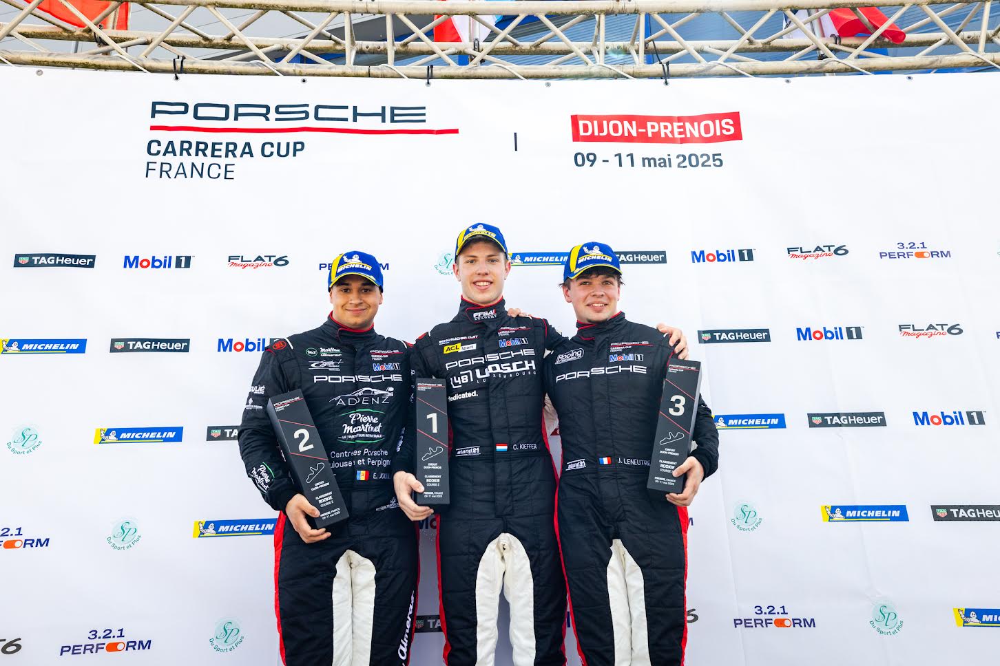 Podium Course 2 Rookie#17 Enzo JOULIÉ (AND), Pro/R, Martinet by Alméras#88 Chester KIEFFER (LUX), Pro-R, CLRT Schumacher#11 Joran LENEUTRE (FRA), Pro/R, Racing TechnologyPorsche Carrera Cup FranceCircuit de Dijon-Prenois, France8 au 11 mai 2025© Alexis Goure